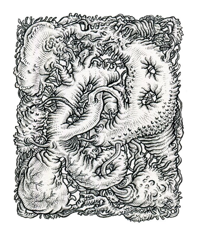 Fineliners and brush pen on paper. 11 x 13 cm.